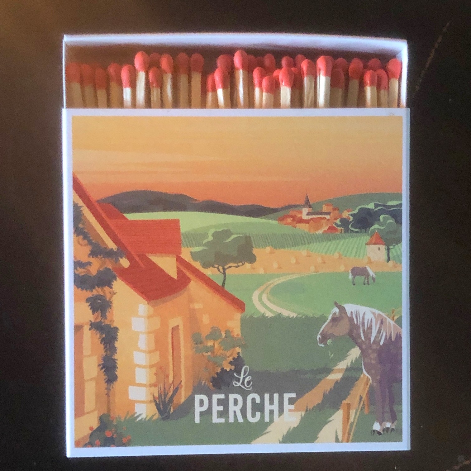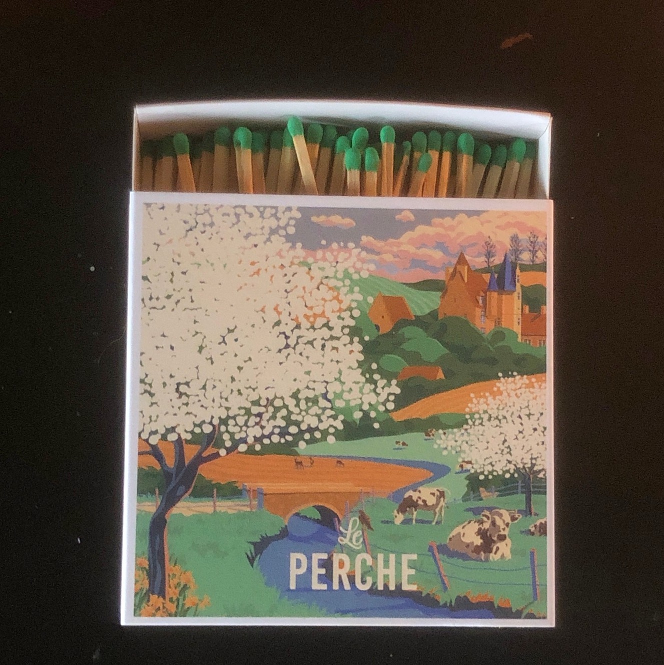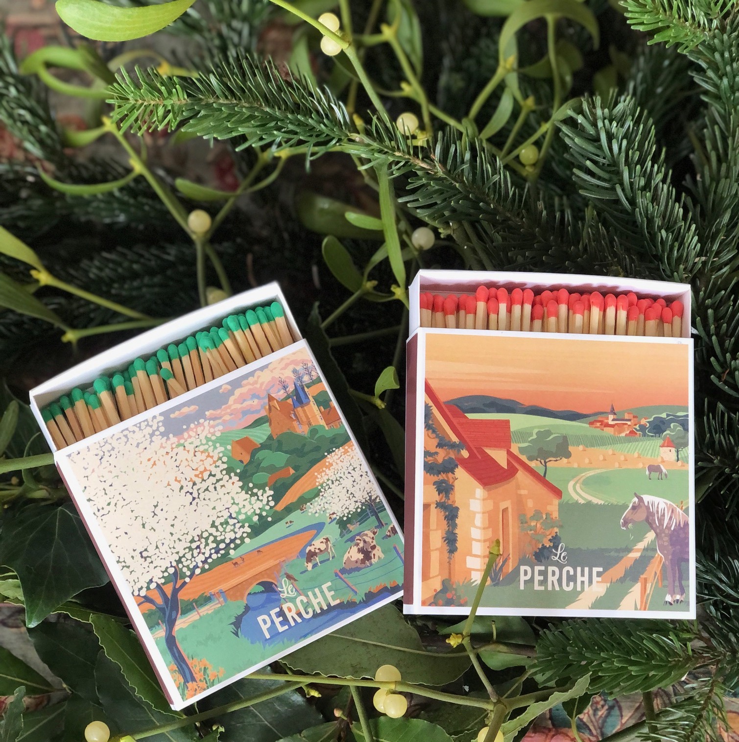 Superbes boîtes d’allumettes “Le Perche”, taille XL signées Studio7Avril mettant en lumière notre région d’adoption.