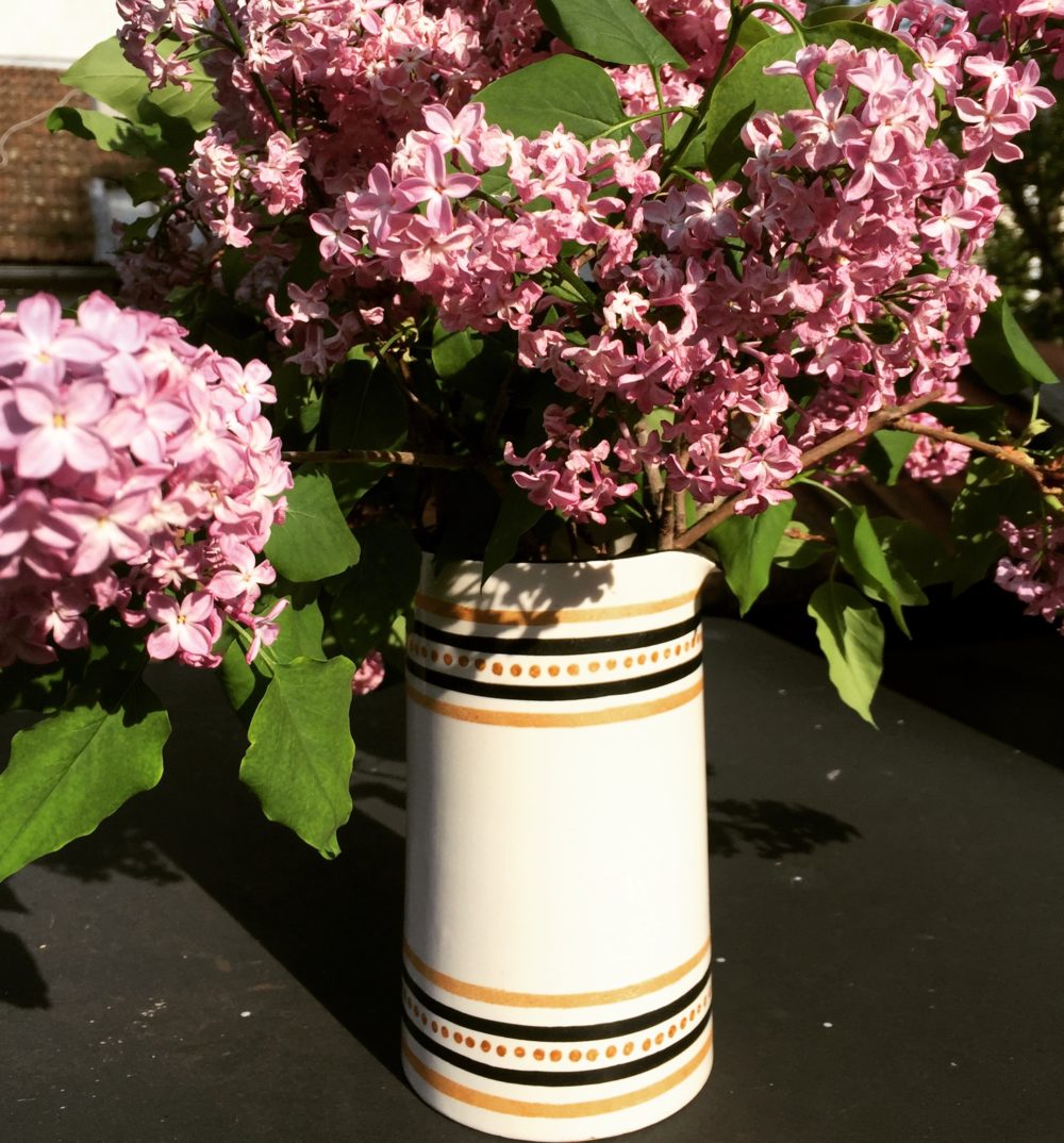 Toute une gamme de vases, tasses, pots, plats à cake et bols entièrement réalisée à la main en céramique vernissée blanche et peinte en noir et or mordoré pour des tables de fêtes !
